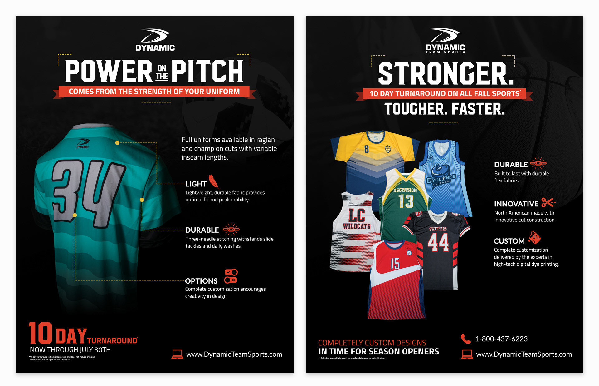 Collateral promoting Dynamic Sports and their parent company, MSP Design Group - a supplier of custom designed team sports jerseys as well as other materials in the branding space.