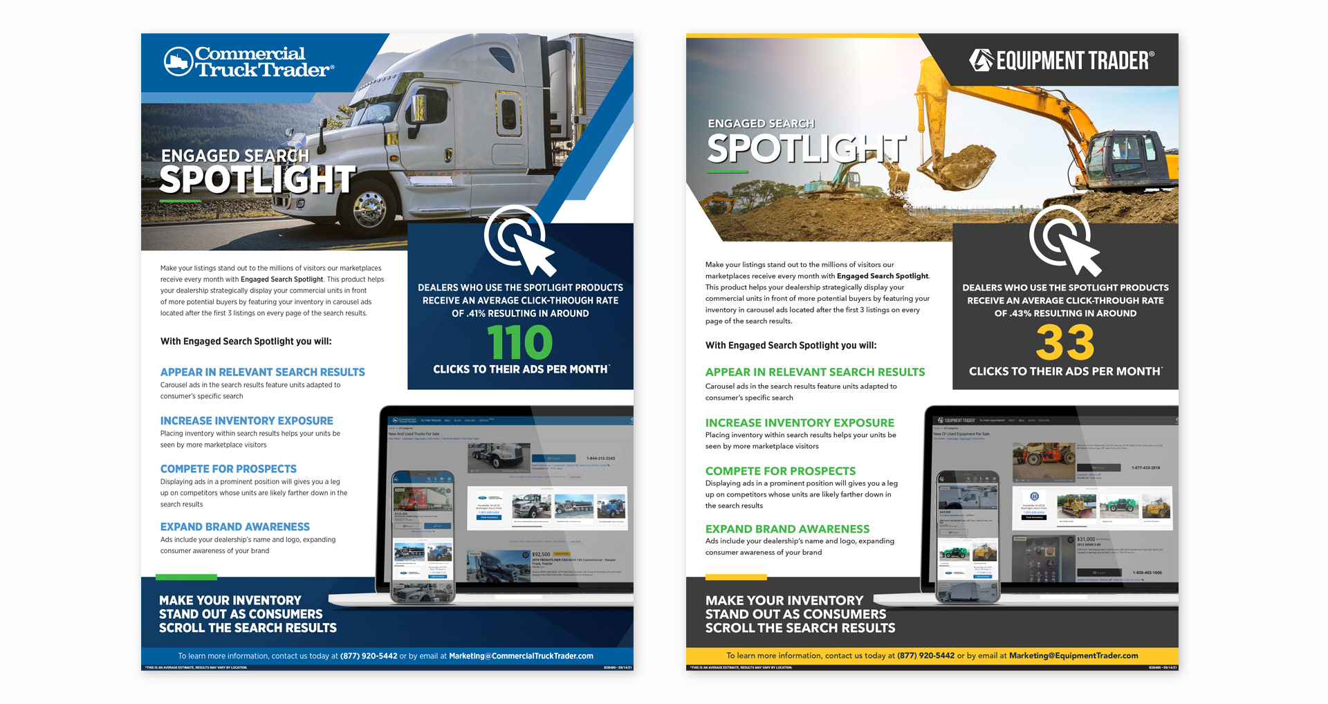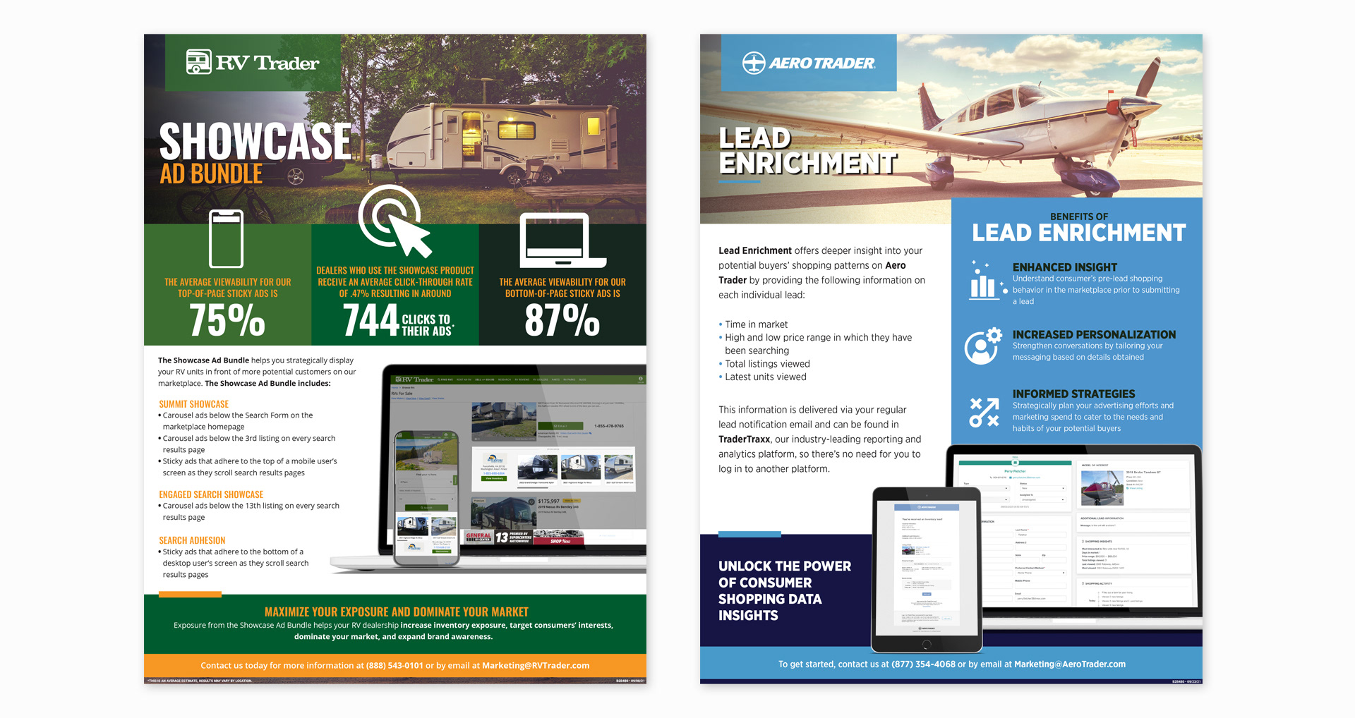 Various flyers created to aid in the sales process for the various realms (RV, Cycle, Equipment, Commercial Truck, Aero, etc.) of Trader Interactive. An exercise in finding something unique within tight brand standards.