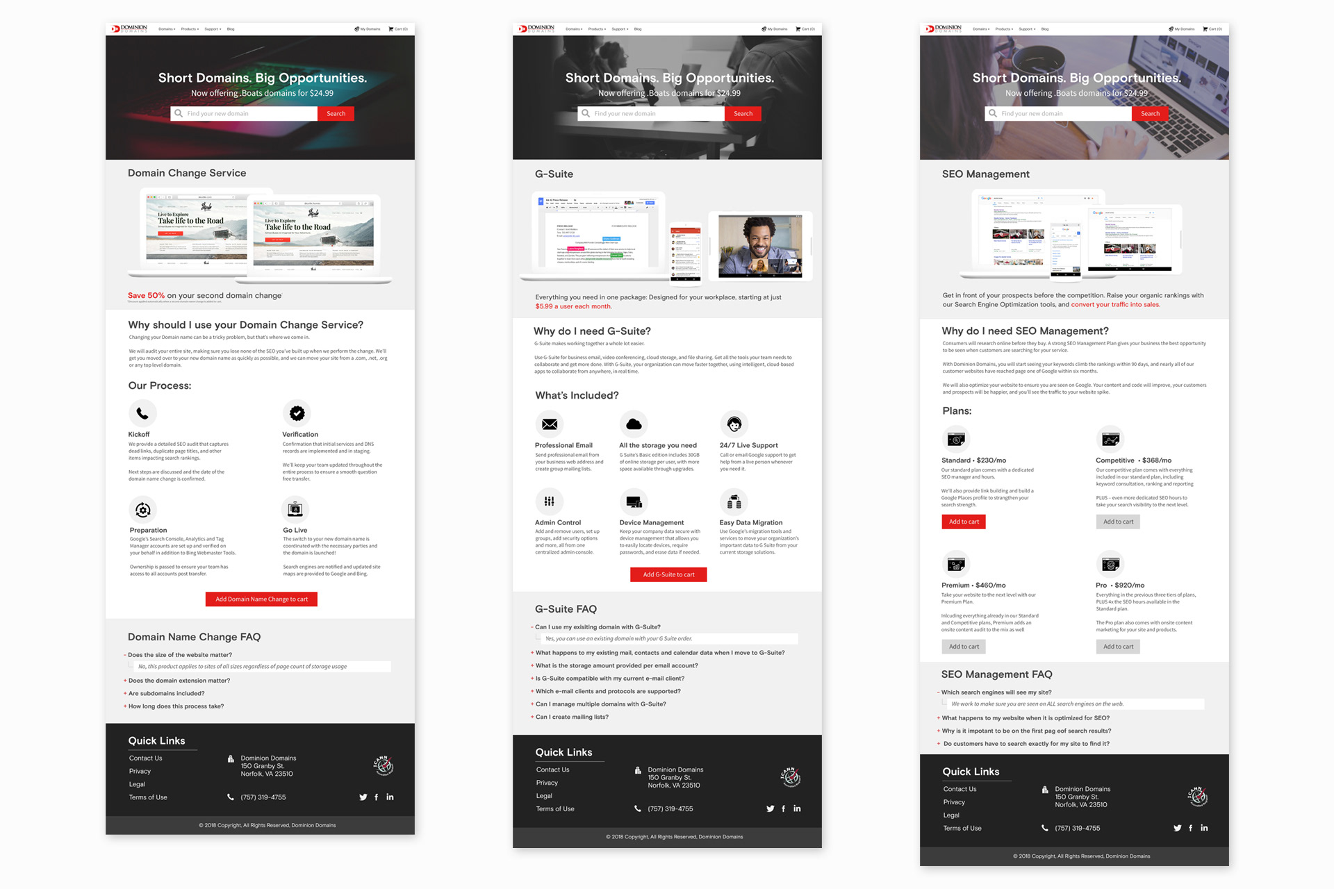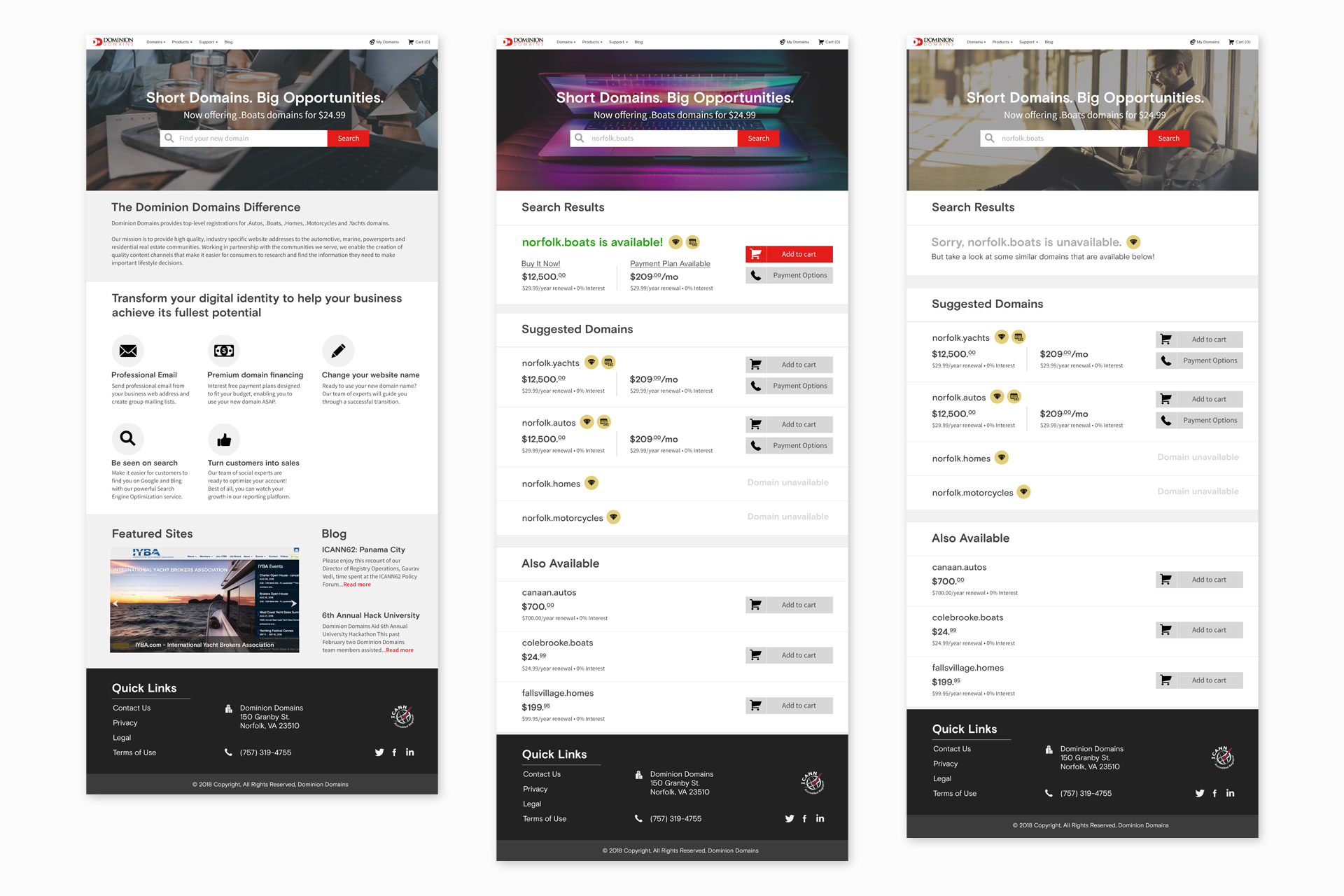Site Redesign concept for the Dominion Domains main page. An attempt to bring continuity in design and an overall easier shopping experience