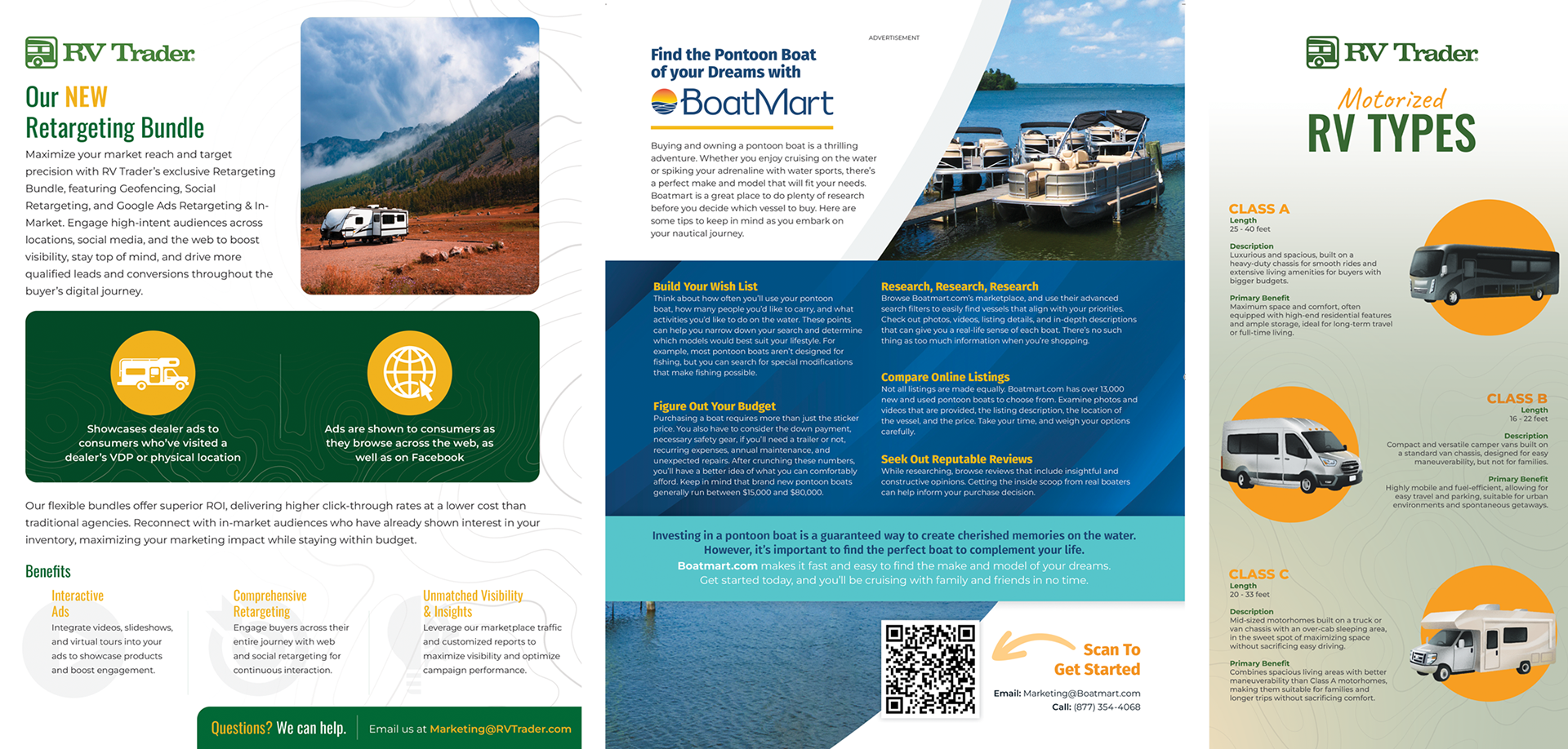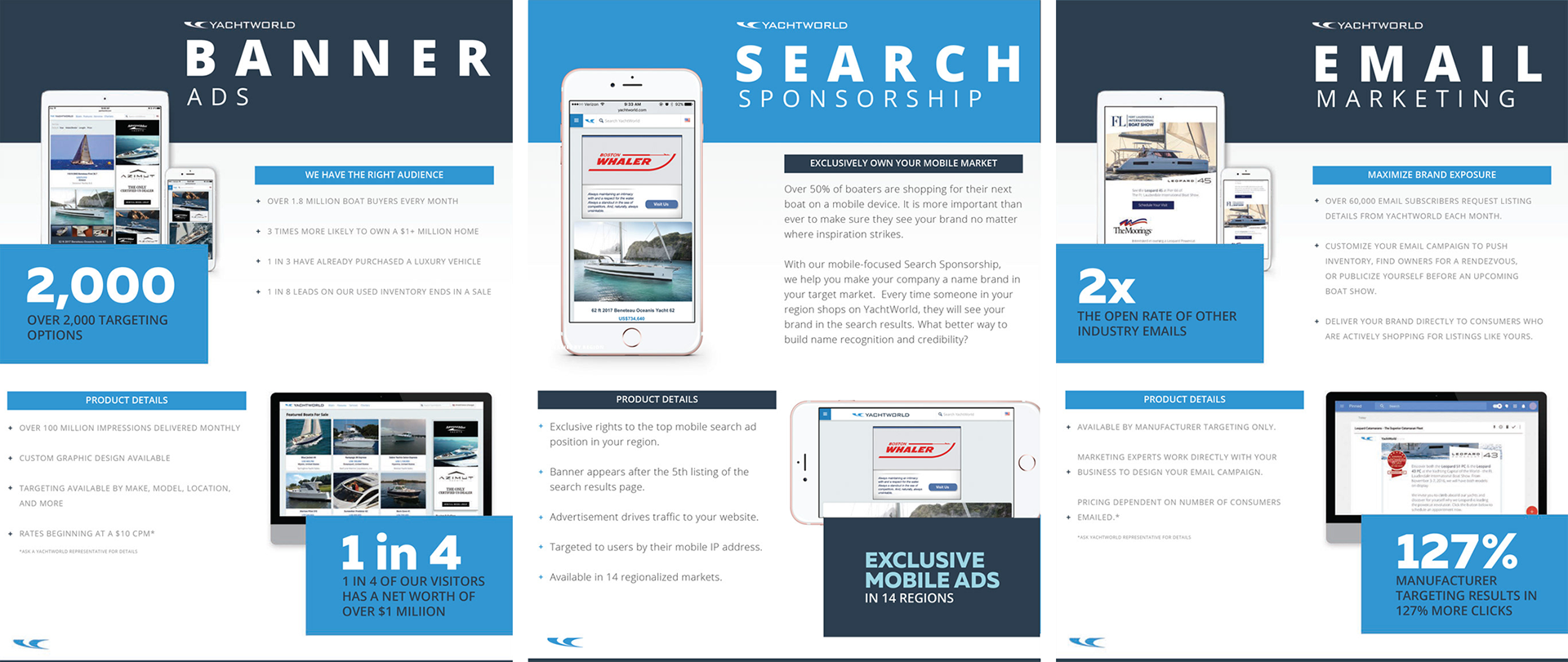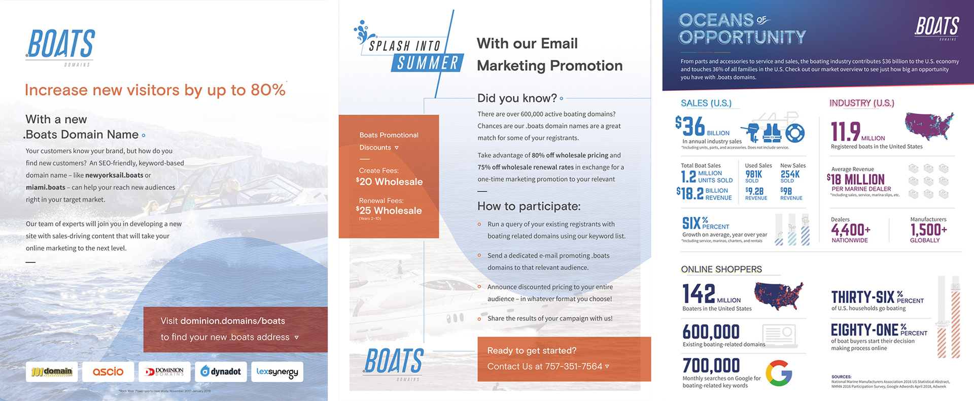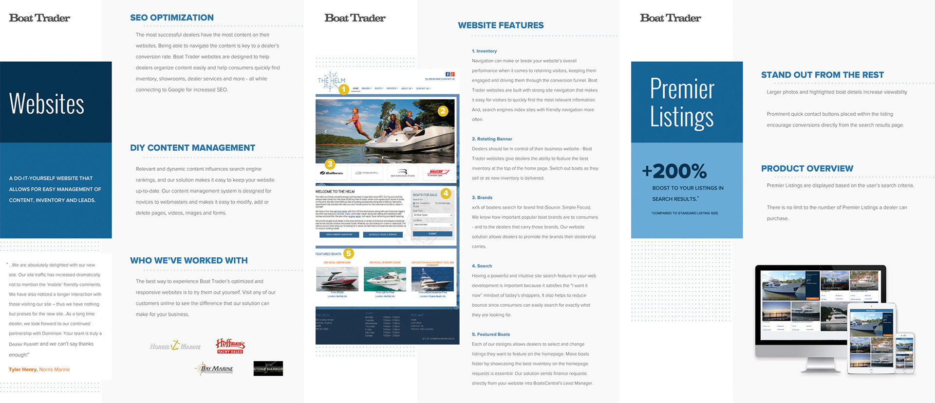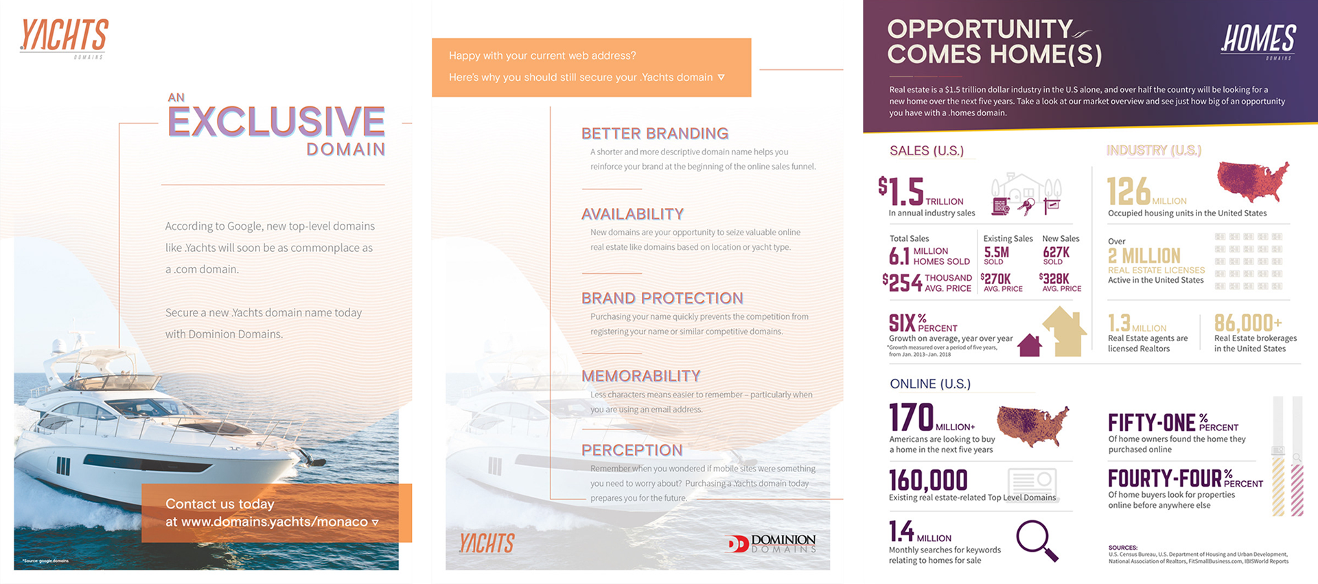 Various pieces of print collateral, product flyers, infographics and magazine ads from my time at Boats Group, Dominion Domains and Trader Interactive.